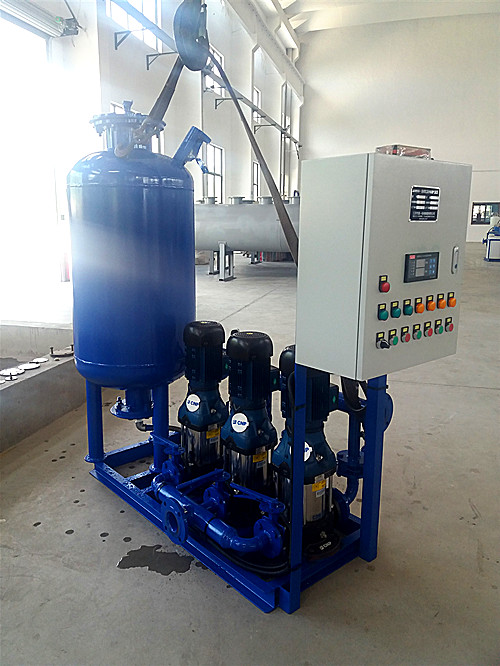 定壓補(bǔ)水裝置是由定壓單元和常壓脫氣膨脹罐兩大部分組成,機(jī)組運(yùn)行時,系統(tǒng)是通過定壓單元來實(shí)現(xiàn)低壓自動補(bǔ)水、超壓自動溢流,保證系統(tǒng)定壓,系統(tǒng)在排氣過程中,是將高壓帶氣泡的水通過常壓脫氣膨脹罐進(jìn)行常壓脫氣,析除循環(huán)水中的氣體。