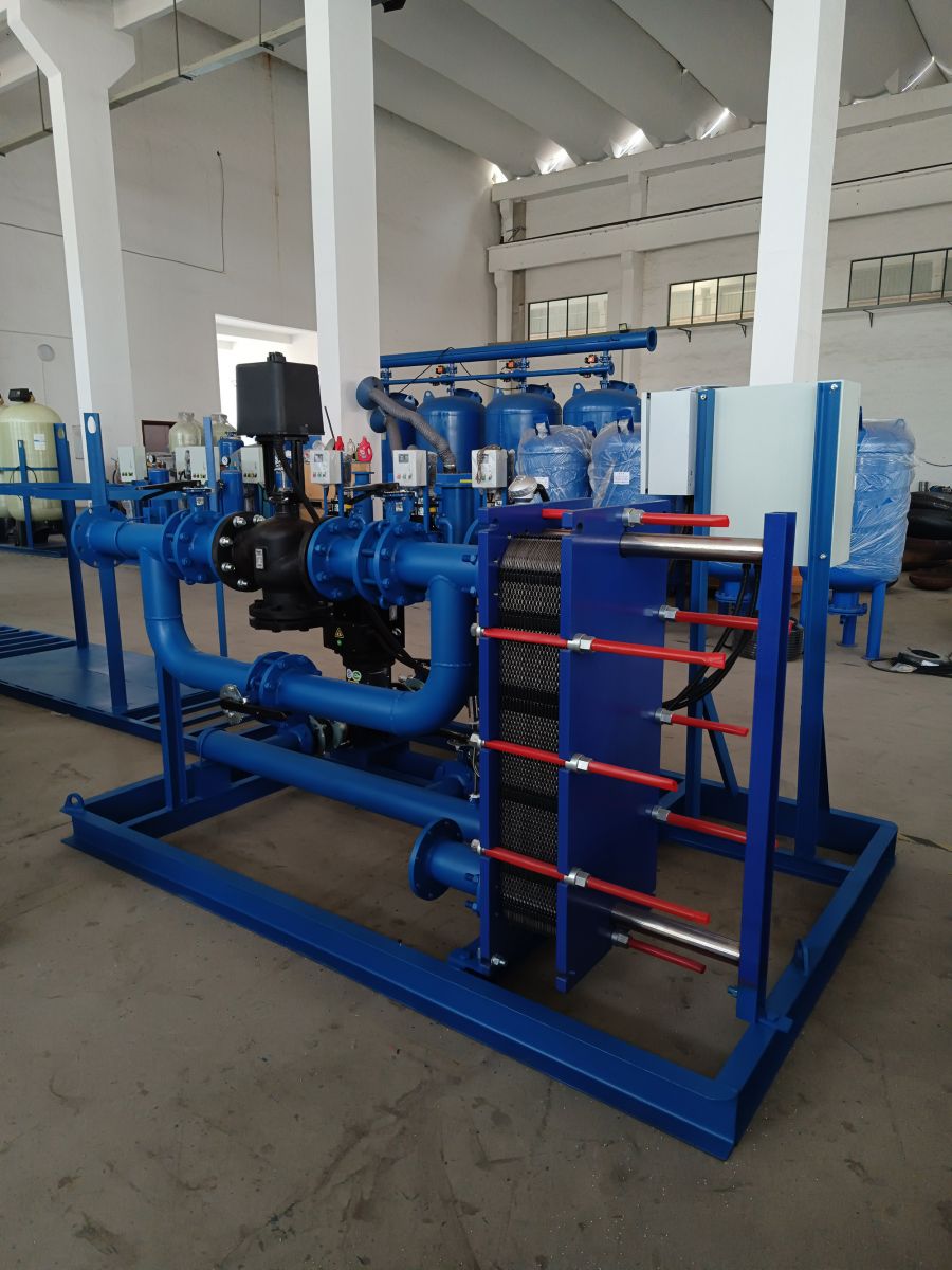 板式換熱機(jī)組,為換熱機(jī)組的一種型號(hào),其特點(diǎn)是采用板式換熱器,在相同壓力損失情況下,其傳熱系數(shù)比管式換熱器高3-5倍,占地面積為管式換熱器的三分之一,熱回收率高。設(shè)備由板式換熱器、智能溫控裝置、智能電控裝置、循環(huán)泵、補(bǔ)水泵、穩(wěn)壓膨脹水箱、補(bǔ)(凝)水箱、過(guò)濾器、閥門(mén)、儀表、傳感器、配管底座等組成。