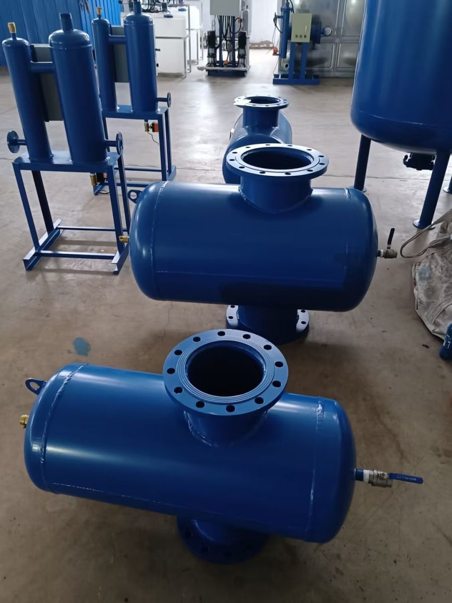 螺旋排氣除污器利用氣水分離、沉降、過濾等機(jī)理。當(dāng)冷卻水、熱水、冷凍水系統(tǒng)中水進(jìn)入螺旋脫氣過濾器時,體積擴(kuò)大,流速急劇降低,水中氣泡分離上升至聚氣區(qū),小氣泡吸附在分離板上,當(dāng)形成大氣泡上升至聚氣區(qū)后通過自動排氣閥排除。