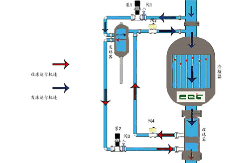 設備采用物理清洗方法,將清洗膠球從發(fā)球器發(fā)送到冷凝器進水端,膠球隨著水流進入每根換熱管,依靠水壓差擦洗換熱管內(nèi)壁。膠球在冷卻水回水端隨著水流進入收球器內(nèi),再將膠球回收至發(fā)球器內(nèi),完成一次清洗循環(huán)。